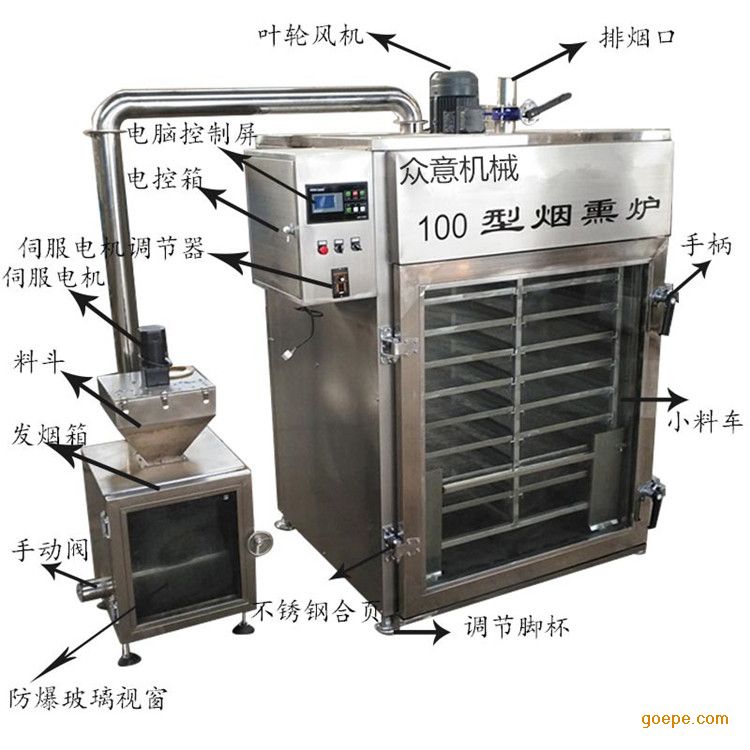 烟熏炉烟熏的产品色泽好,口感更佳。质量保证,技术优良,操作方便.经过烟熏后食品的颜色好看,还有一种烟熏后的香味,让人感觉香而不腻,也能达到环保效果,彻底代替了传统的烟熏炉方法,节省了工人的劳动了,提高工作效率,更增强了食品的口感及弹性。主循环风扇送风均匀,使炉体内温度均匀,采用设定参数方式,通用性广,自动运行中的参数可修正.烟熏炉主要功能有:蒸煮、烘干、烟熏、上色等,根据不同的产品需求,也能增加冷熏,喷雾和其他可选特性,适用于香肠、熏肉、鱼肉、鸡腿、鸭脖子、牛肉干等食品的加工处理。